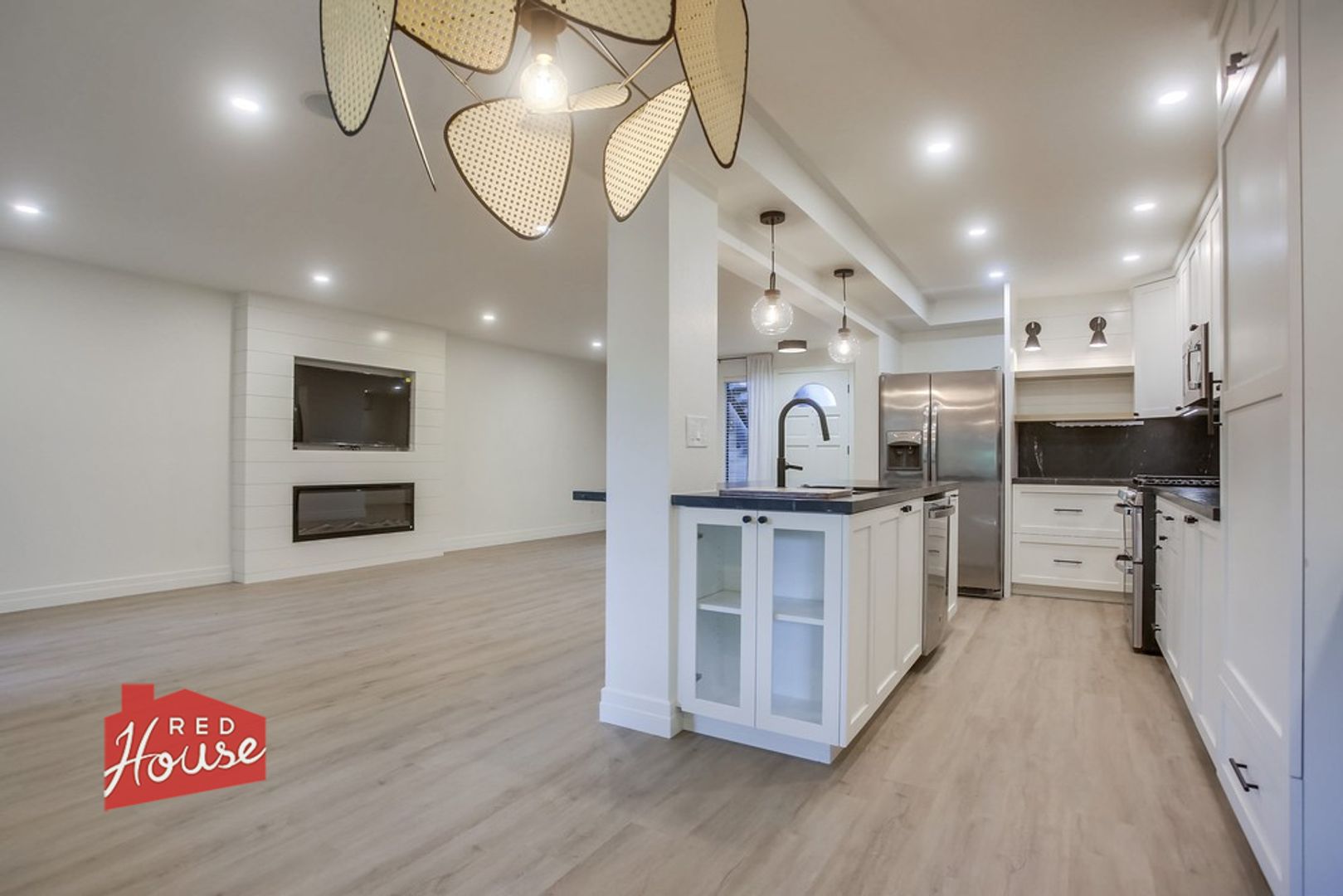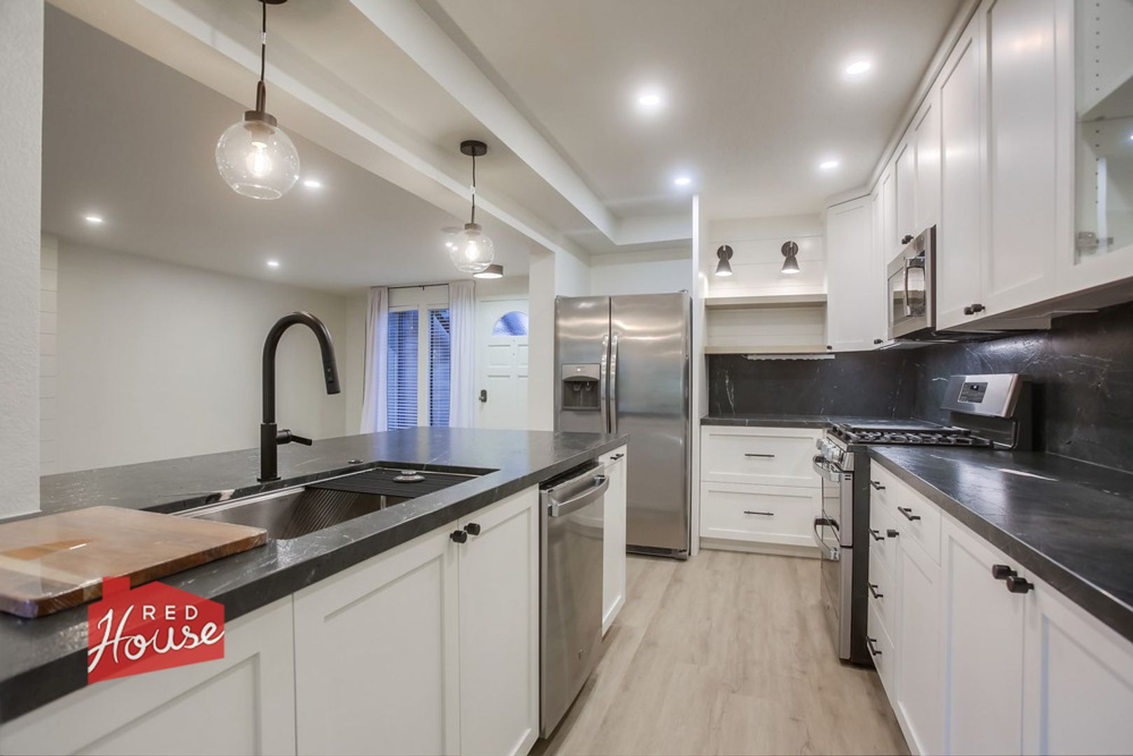Designer-remodeled coastal residence with high-end finishes and a refined, modern aesthetic. This two-story home features luxury vinyl plank flooring, Van Gogh marble countertops, and seamless quartz slab showers for a clean, upscale feel. The open-concept layout offers a bedroom and full bath on the main level, with a private primary suite upstairs. The chef’s kitchen includes stainless steel appliances, custom cabinetry, under-cabinet lighting, and an oversized island ideal for entertaining.