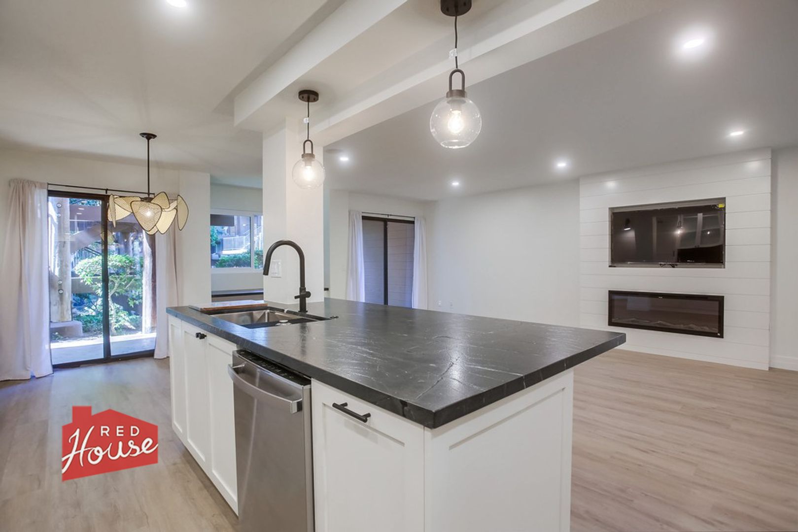 The living space is anchored by a shiplap feature wall, electric fireplace, and built-in media, flowing effortlessly into a dining area with custom buffet. The primary bath offers a soaking tub and separate walk-in shower. Enjoy indoor-outdoor living with a private patio, direct access to the pool, and a scenic path to the beach. Complete with in-unit laundry, attached garage, and additional parking.